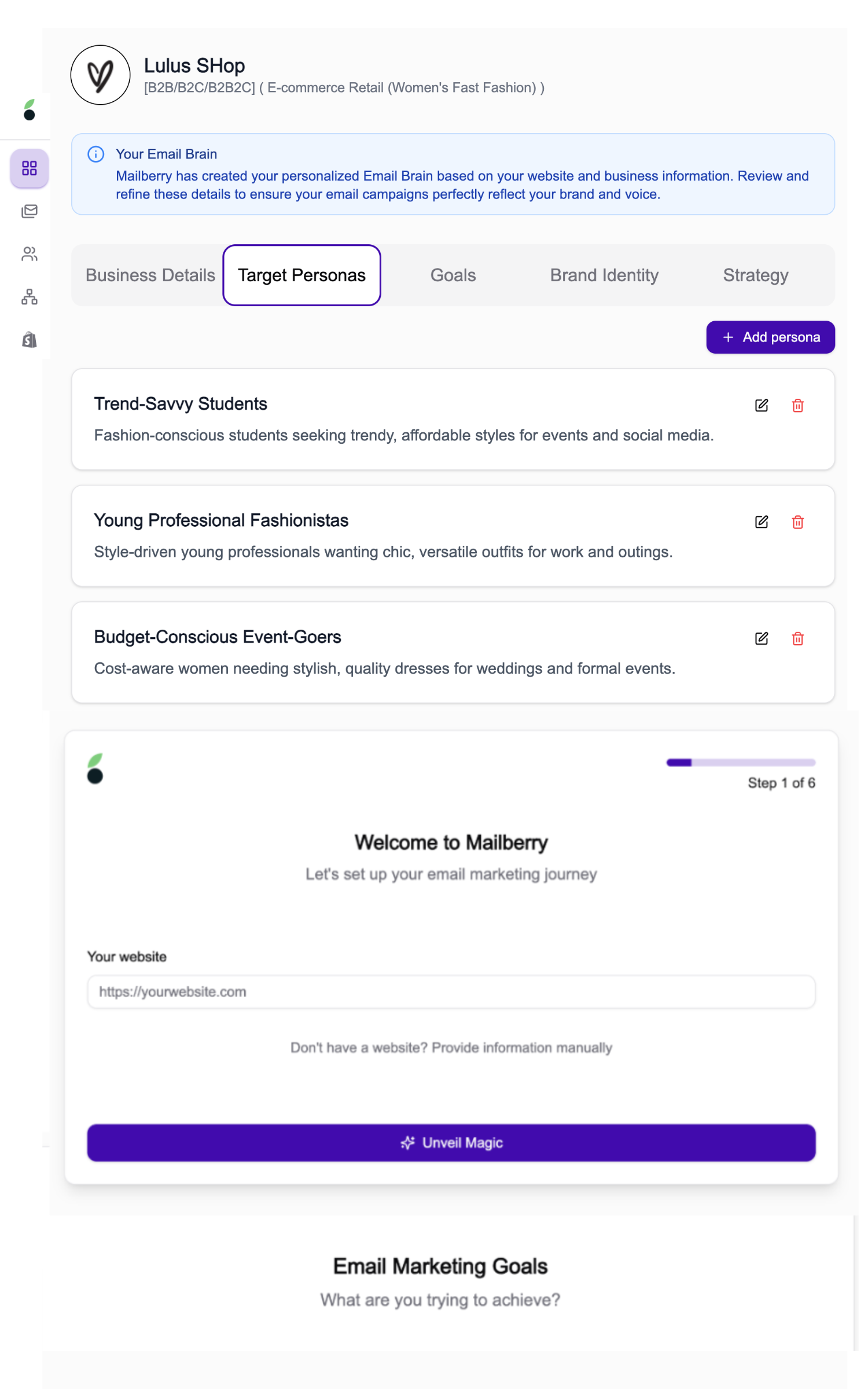 Using everything it learned, Mailberry creates your Email Brain™ — a comprehensive growth system that understands your audience, goals, email objectives, and brand voice.