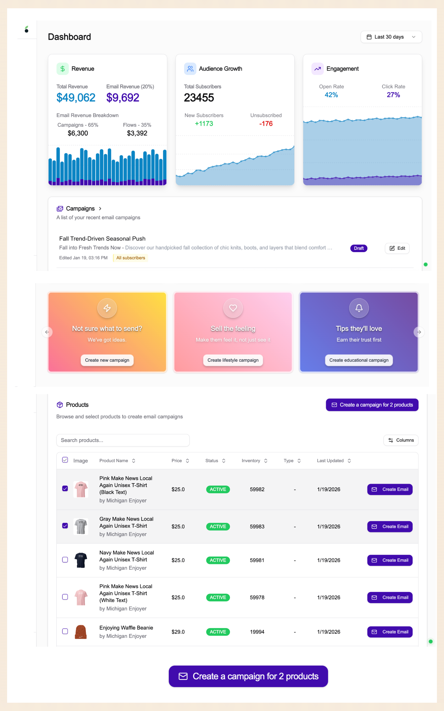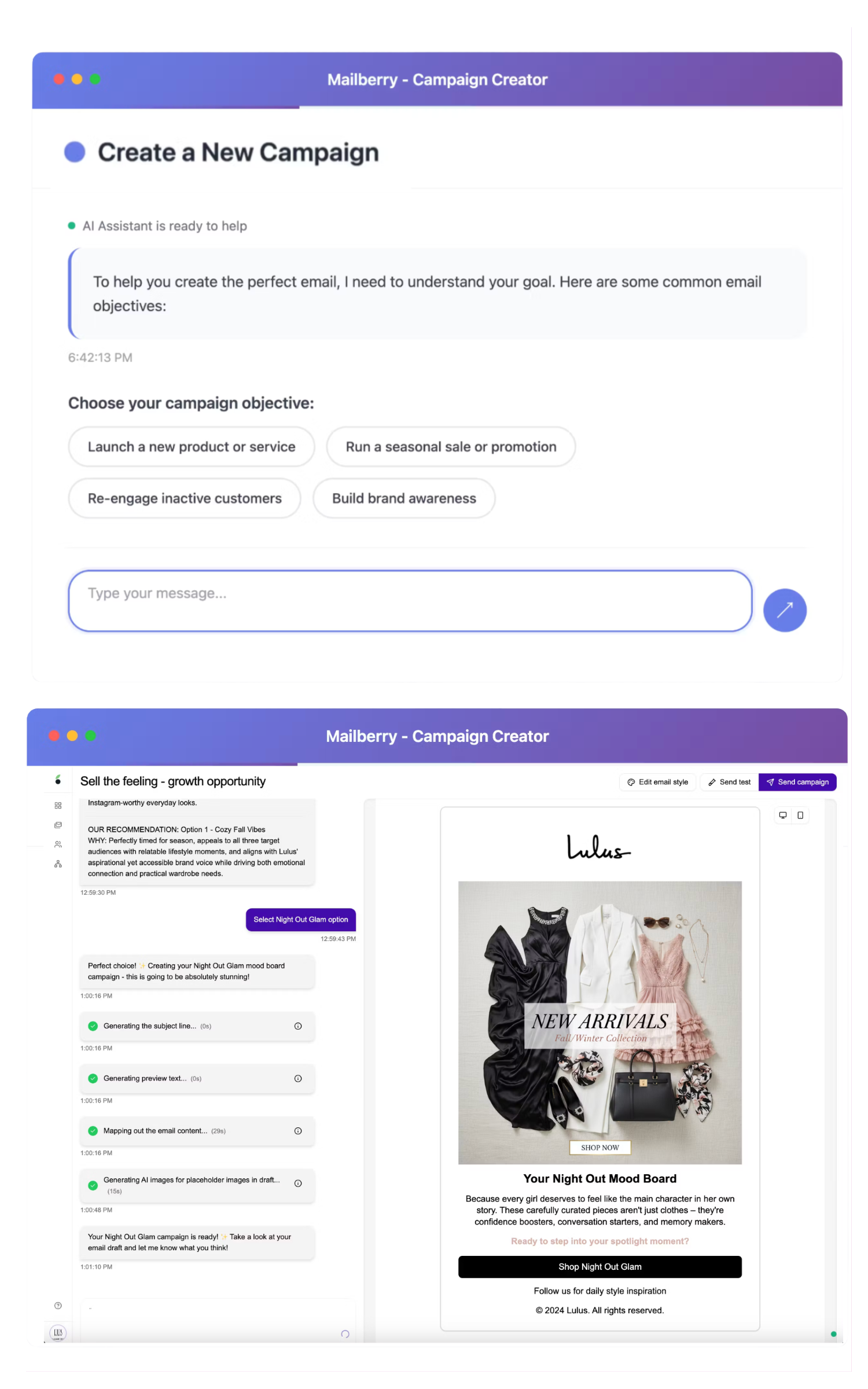 Mailberry creates on-brand campaign copy and layouts based on your products and audience — so emails look polished, consistent, and ready to sell.